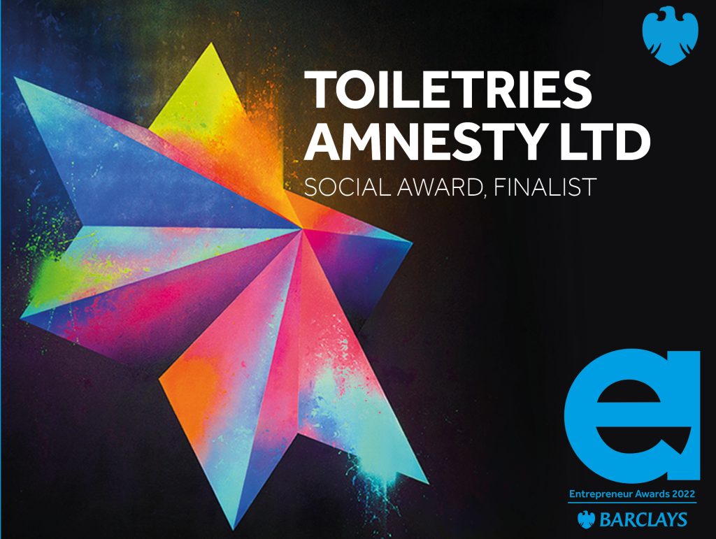 We’re very pleased to be able to tell you that Toiletries Amnesty has been announced as a Regional Winner and National Finalist in the Barclays Entrepreneur Awards 2022!